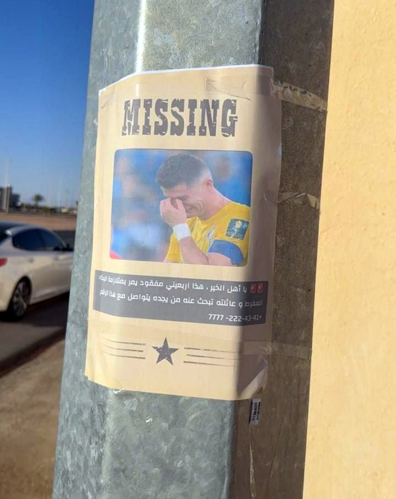 Səudiyyə Ərəbistanının bəzi küçələrində "Əl-Nəsr"in portuqaliyalı hücumçusu Kriştiano Ronaldonun itkin düşməsi ilə bağlı ironik posterlər peyda olub.