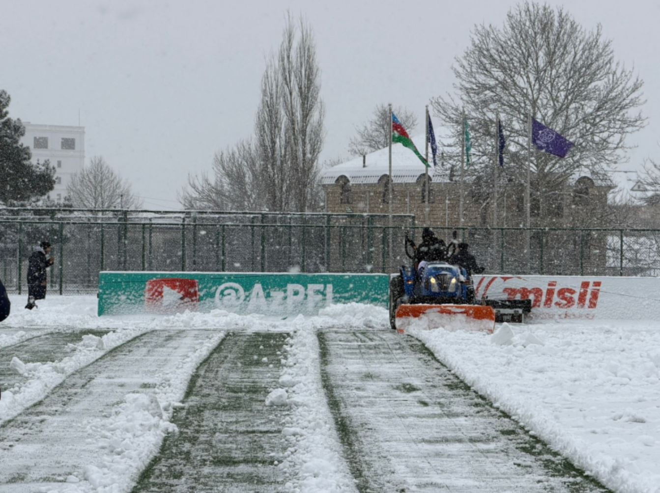 Hazırda, stadionun ot örtüyünün qardan təmizlənməsi prosesi davam edir.